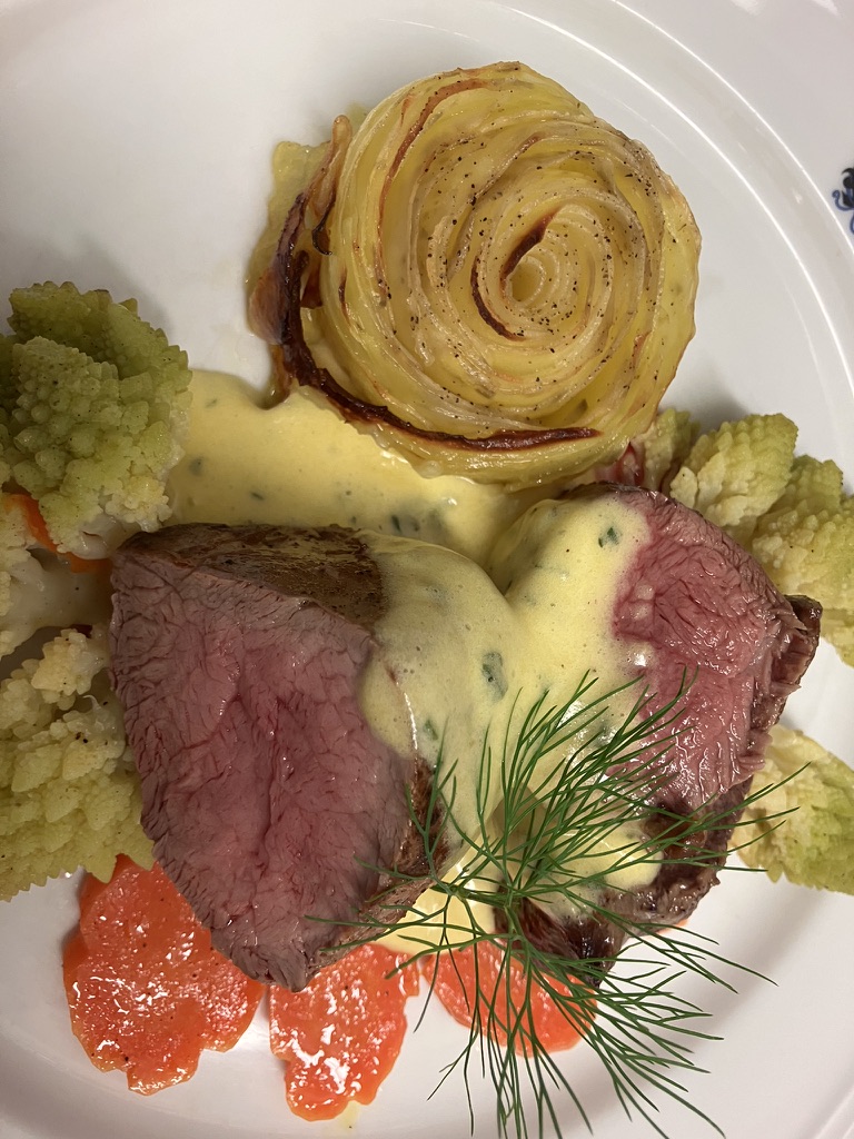 - rosa gebratenes Roastbeef auf Waldpilzen mit Thaispargel und Kartoffelrose